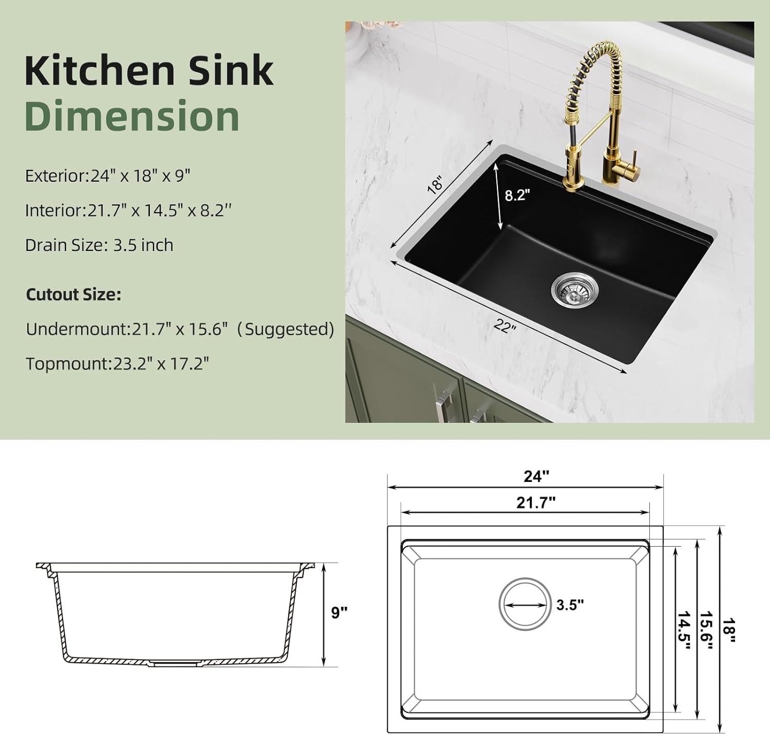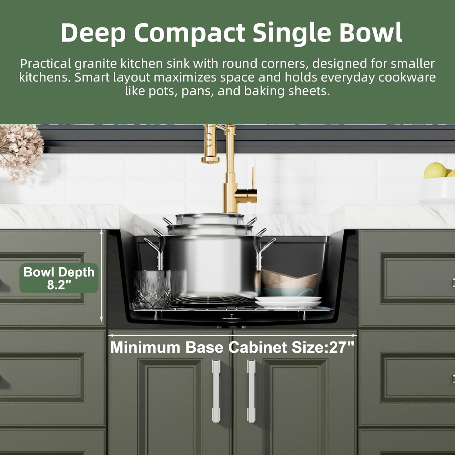 | Included Components | Granite Composite Kitchen Sink, Sapele Hardwood Cutting Board, Roll-up Drying Rack, Expandable Drying Basket, Bottom Grid, and Drain |